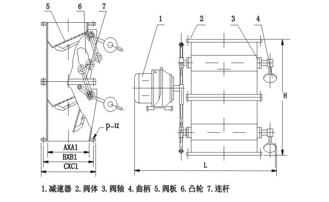 由减速器带动传动杆通过曲柄、凸轮及连杆分别带动上、下两传动轴旋转,交互开启,通过配备的杠杆系统或拉伸弹簧,保证阀板可靠的复位,防止野风吹入,依确定的开闭频率完成系统的给卸料。